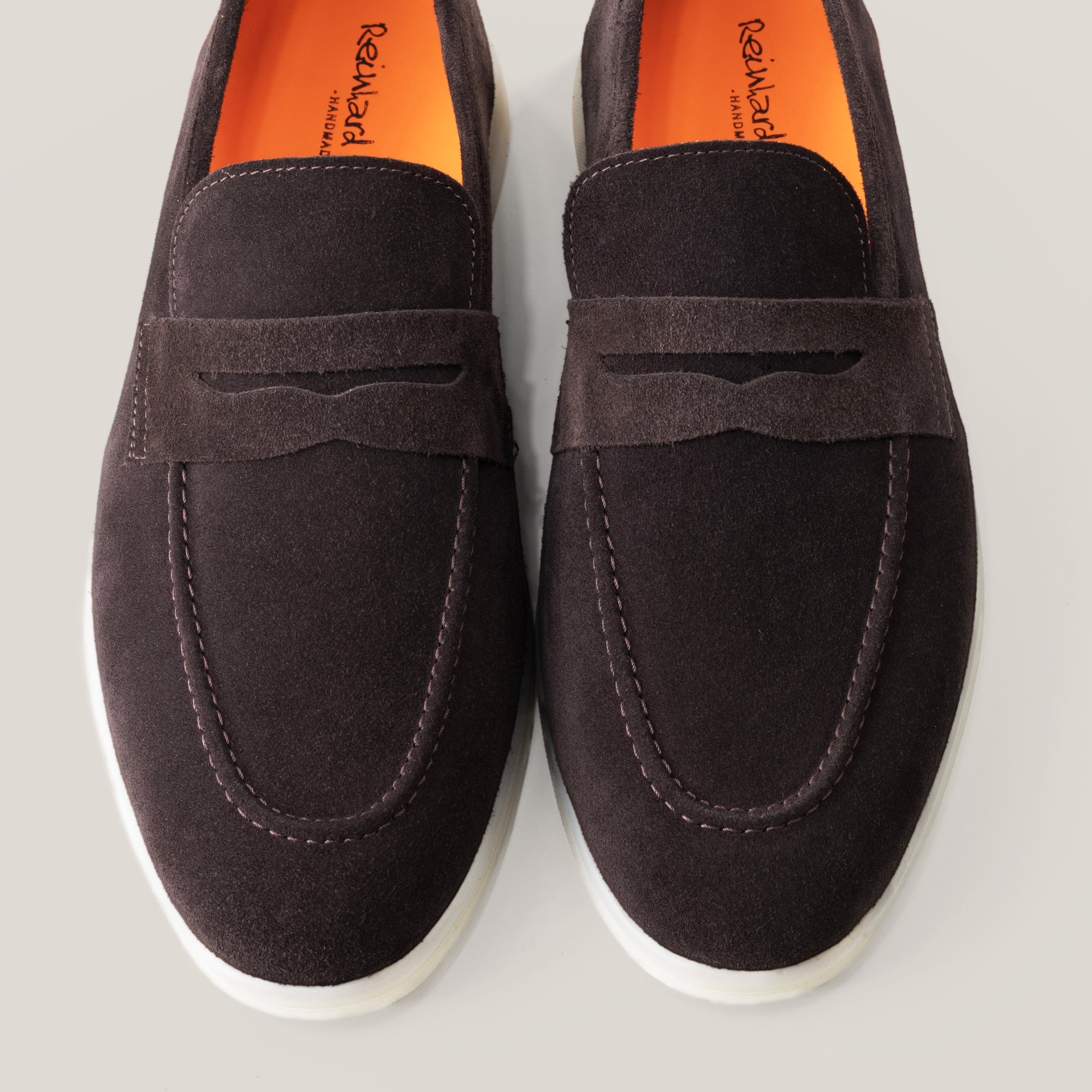 De Portofino Donkerbruine Suède Penny Loafers belichamen handgemaakte luxe zonder het luxe prijskaartje. Deze Smart Luxury Loafers, in een rijke donkerbruine kleur, worden met uiterste precisie met de hand vervaardigd in ons atelier, gebruikmakend van verantwoord ingekocht Italiaans kalfsuède.
